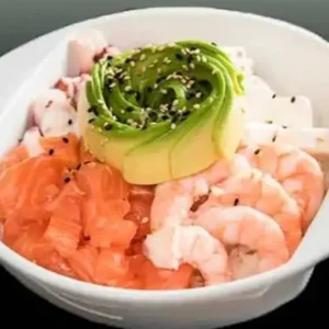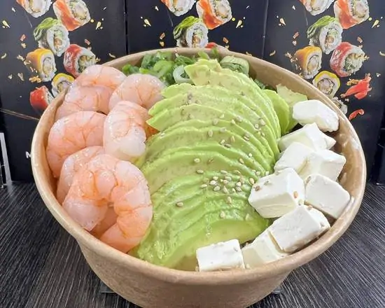 Base Arroz o Lechuga, Palta Cebollín, Sésamo, Queso Camarón cocido»,