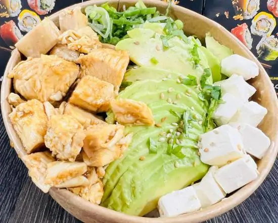Base Arroz o Lechuga, Palta Cebollín, Sésamo, Queso, pollo teriyaki»,
